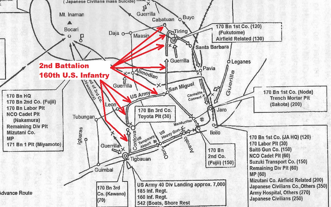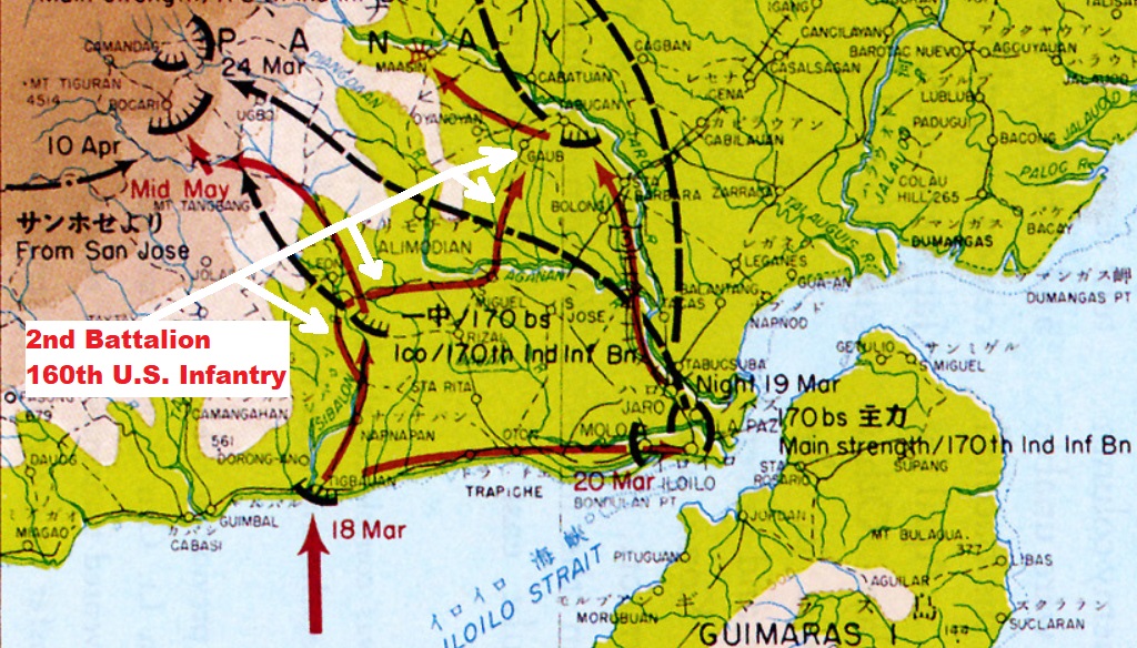 When the 40th Infantry Division arrived in Iloilo on March 18, 1945, it was composed of 4 Infantry battalions. The 185th Infantry Regiment had all of its three battalions present while the 160th Infantry Regiment had only one battalion present, the "2nd Battalion." Its two other battalions would arrive a few days later.