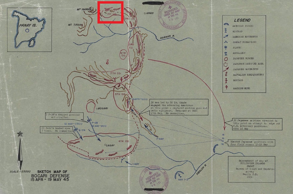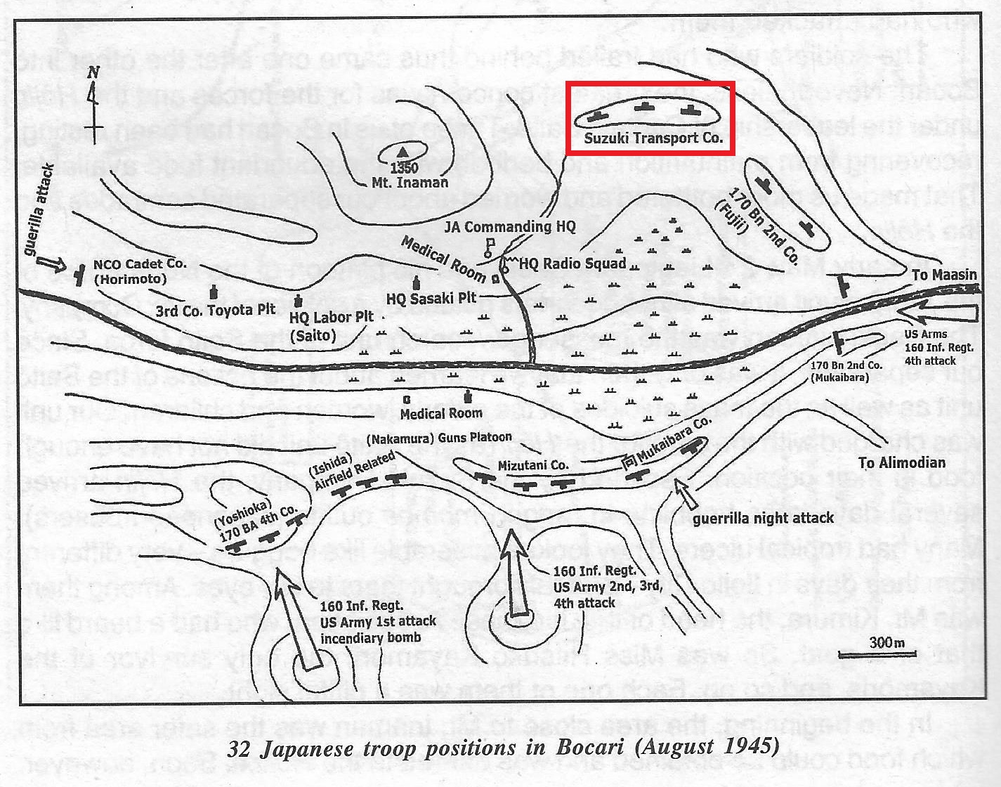 As everyone assembled, we decided on the positions of each of the forces. We could take a rest and regain physical health with abundant food, but we worried about the lack of ammunition. For the two mortars, there were only a dozen shells. Each soldier had only 140 to 150 bullets for their rifles. There were still a few thousand rounds for machine-guns but we did not have enough for a proper battle. All we could do was to pray that the enemy would not attack us.2nd Battalion 160th Infantry Regiment attacks Bocari in April and May 1945.