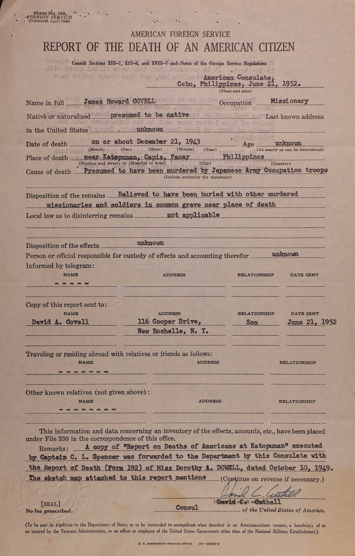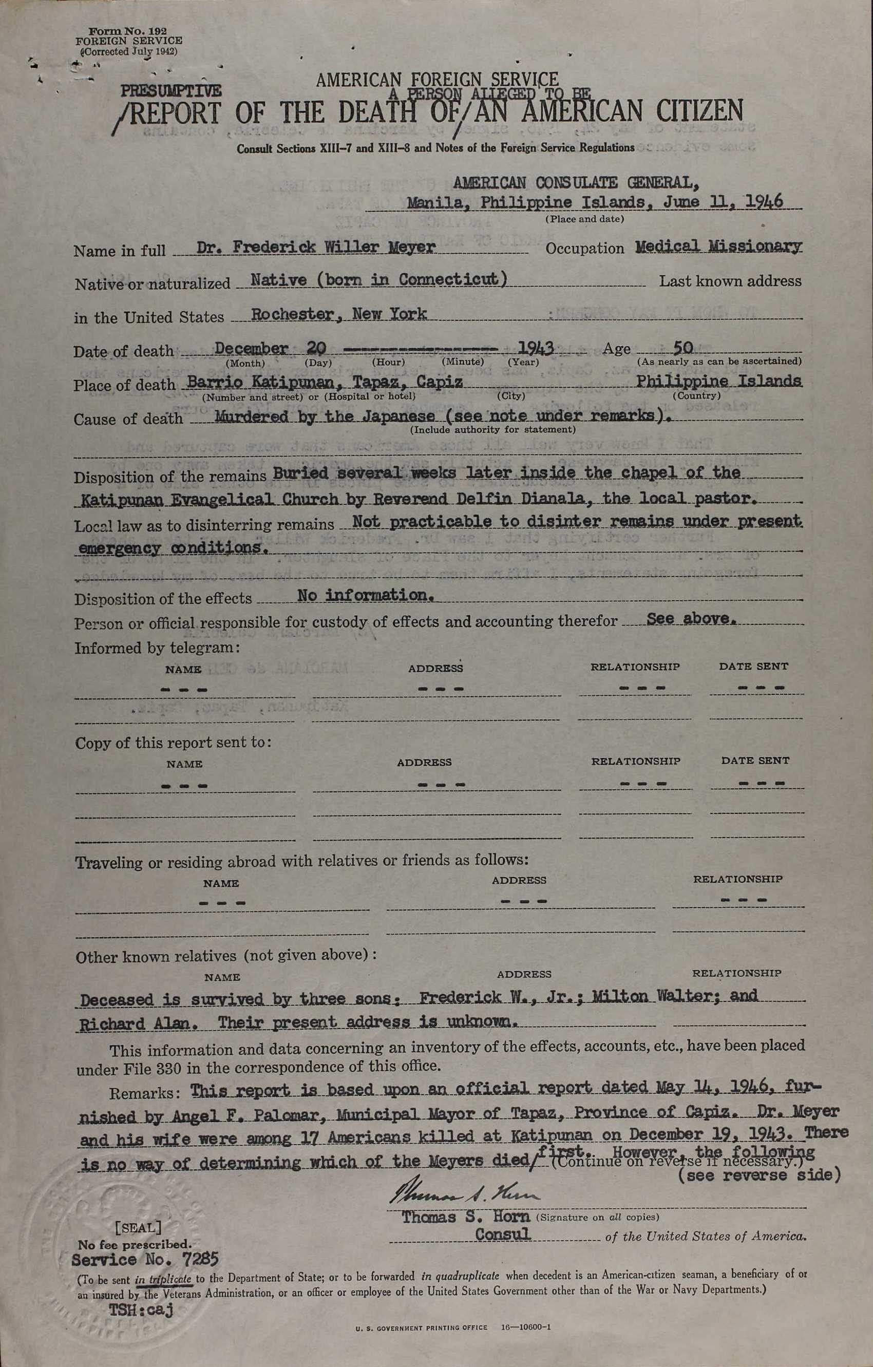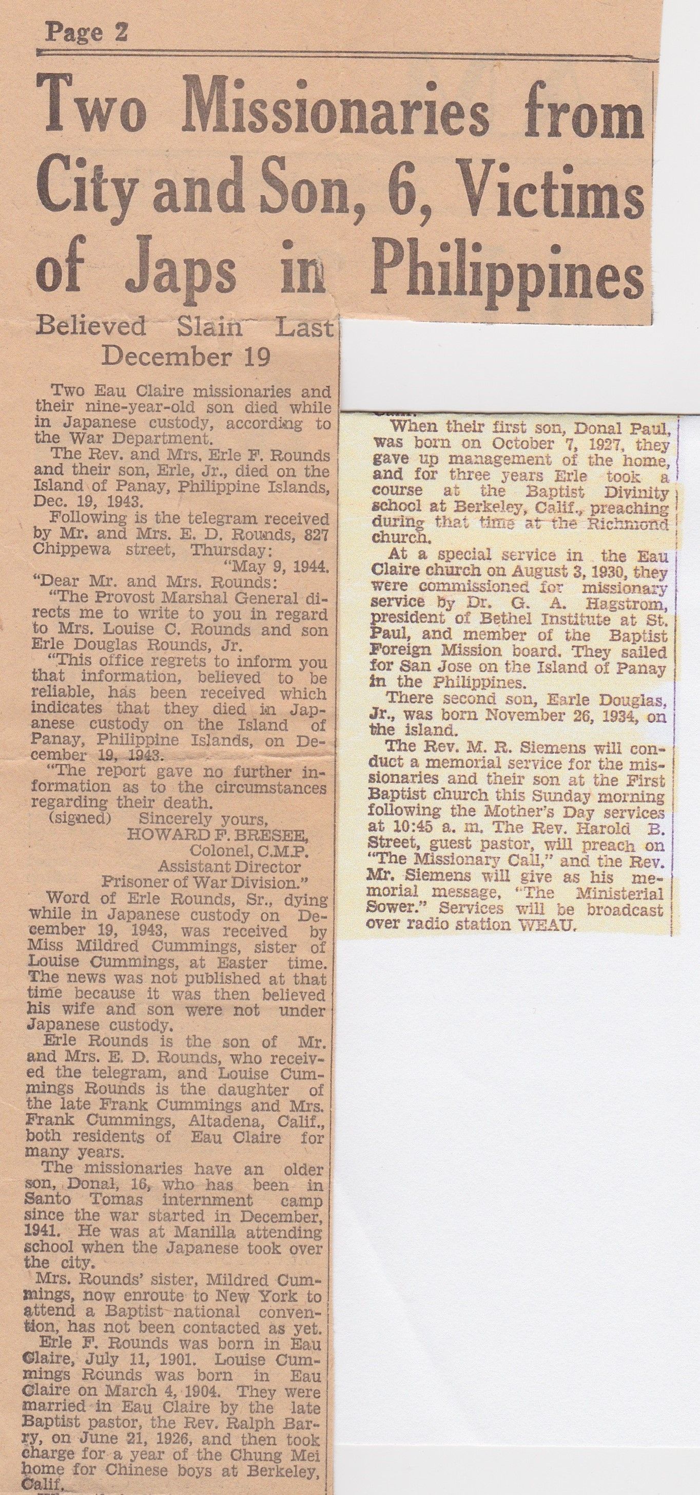 The names of the victims were listed as follows: Miss Jennie C. Adams, nurse, of Page, Neb. James H. Covell, teacher, Athens, Pa., and LeRoy, N.Y. Mrs. Covell. Miss Dorothy A. Dowell, evangelist, Denver, Colo. Miss Signe A. Erickson, teacher, Warren, Pa. Dr. Frederick W. Meyer, physician, New Haven, Conn. Mrs. Meyer Rev. Francis H. Rose, Norwich, Conn., and Lowell, Mass. Mr. Rose Rev. Erle F. Rounds, Eau Claire, Wis., and Richmond, Calif. Mrs. Rounds Erle Douglas Rounds, 9, son of Rev. and Mrs. Rounds The society said the missionaries had escaped the Japanese for two years but finally were betrayed by a captured Filipino guerrilla officer.