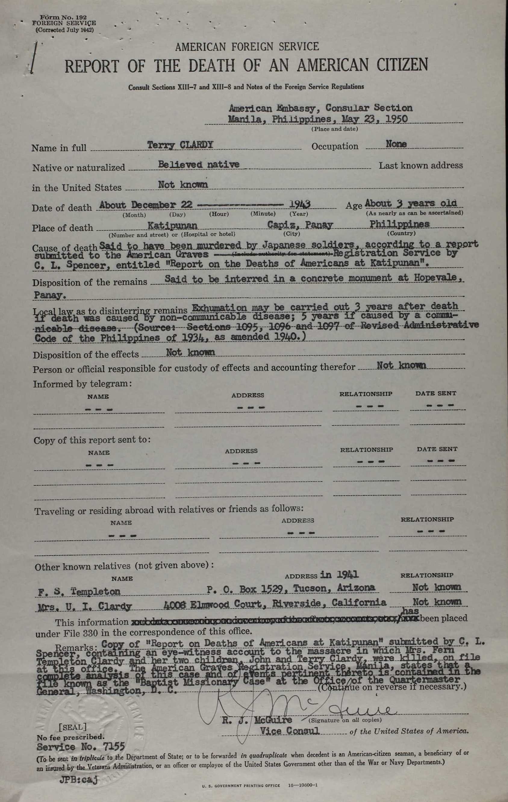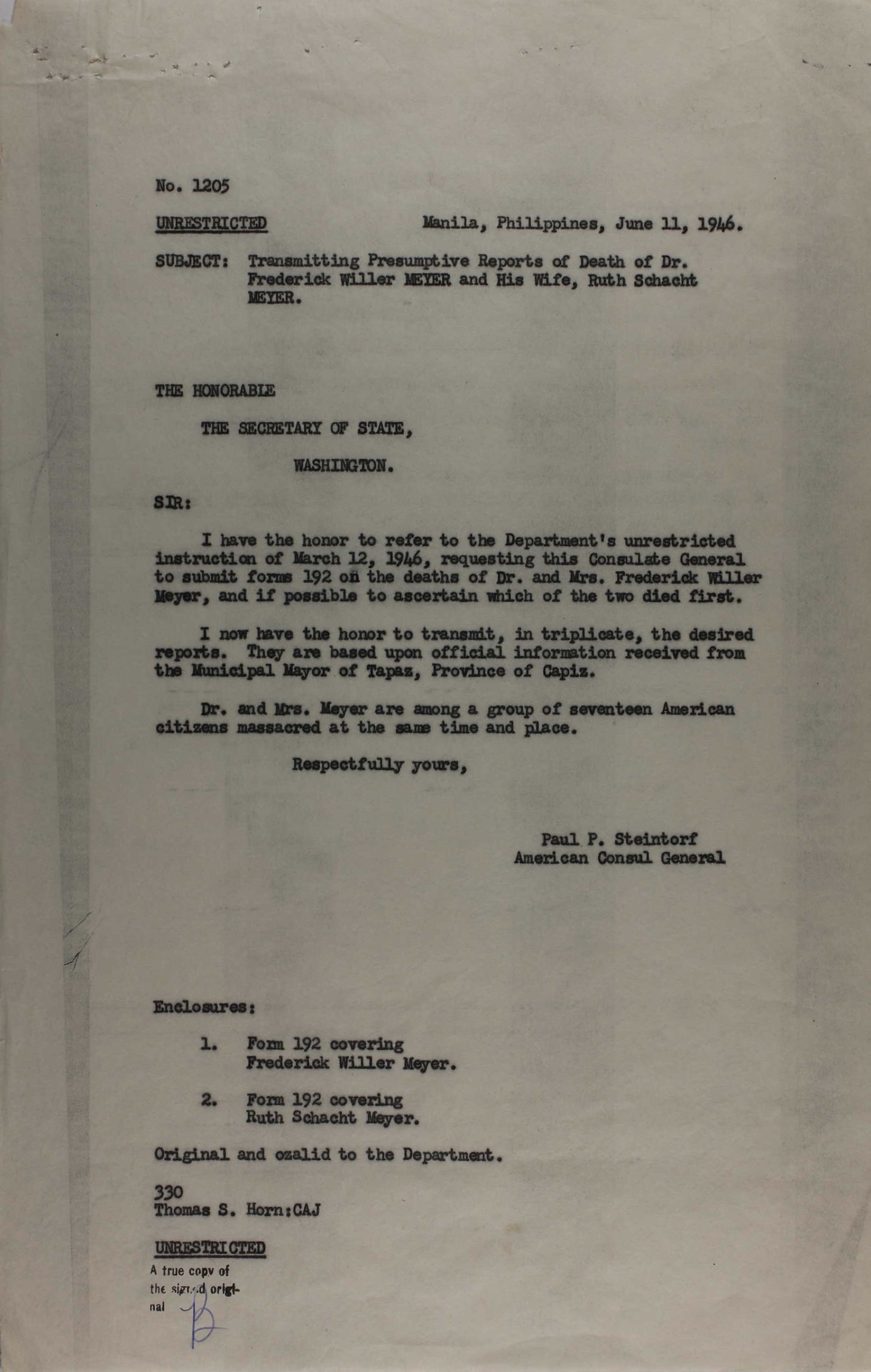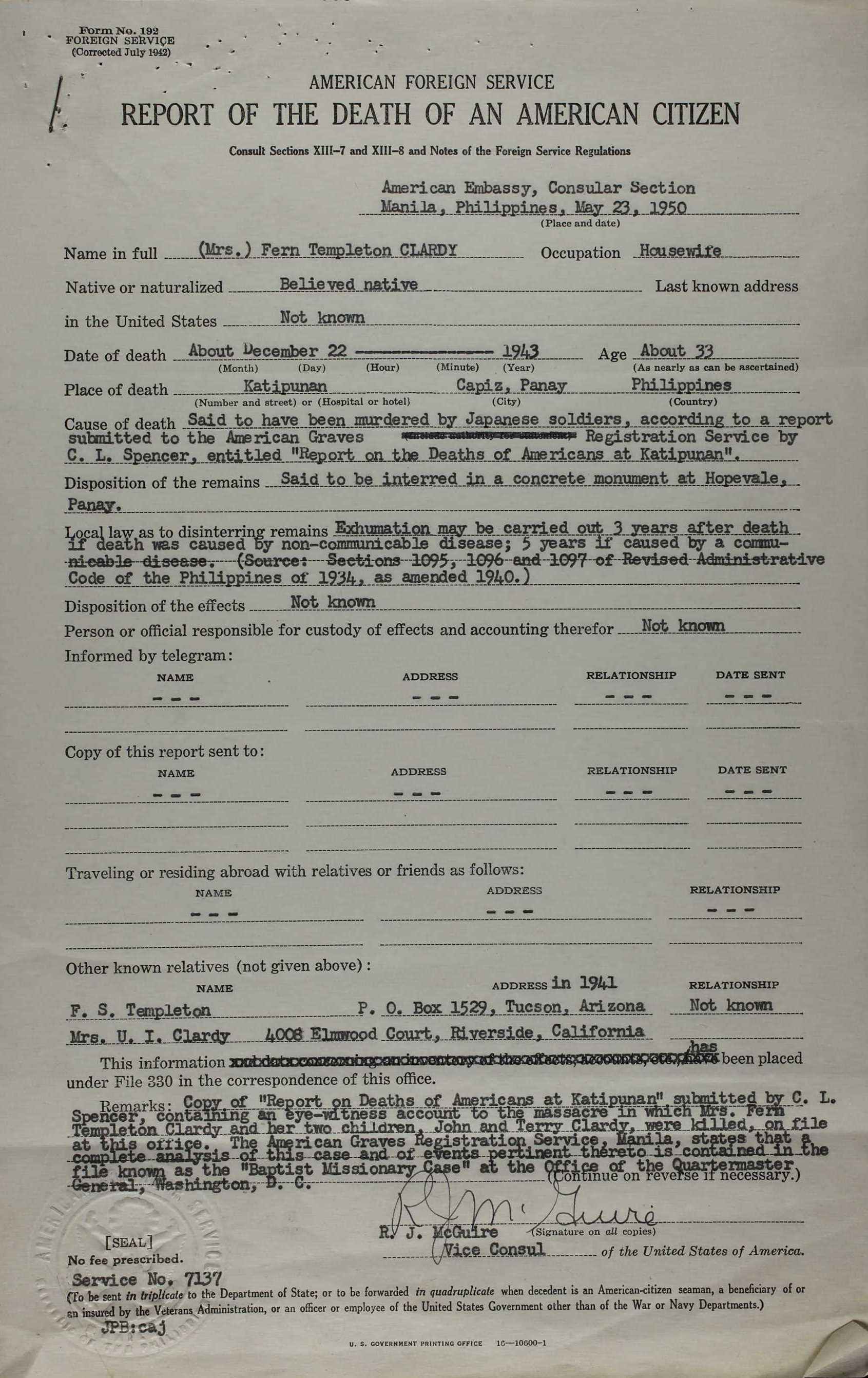 The names of the victims were listed as follows: Miss Jennie C. Adams, nurse, of Page, Neb. James H. Covell, teacher, Athens, Pa., and LeRoy, N.Y. Mrs. Covell. Miss Dorothy A. Dowell, evangelist, Denver, Colo. Miss Signe A. Erickson, teacher, Warren, Pa. Dr. Frederick W. Meyer, physician, New Haven, Conn. Mrs. Meyer Rev. Francis H. Rose, Norwich, Conn., and Lowell, Mass. Mr. Rose Rev. Erle F. Rounds, Eau Claire, Wis., and Richmond, Calif. Mrs. Rounds Erle Douglas Rounds, 9, son of Rev. and Mrs. Rounds The society said the missionaries had escaped the Japanese for two years but finally were betrayed by a captured Filipino guerrilla officer.