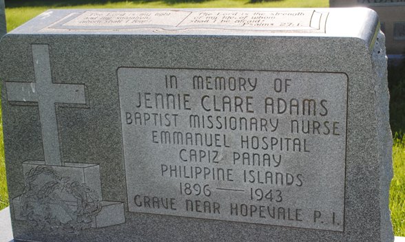 LEFT: Miss Jennie Clare Adam, missionary nurse for nineteen years on Panay Island, Philippines before she was beheaded by the Japanese in December 1943.