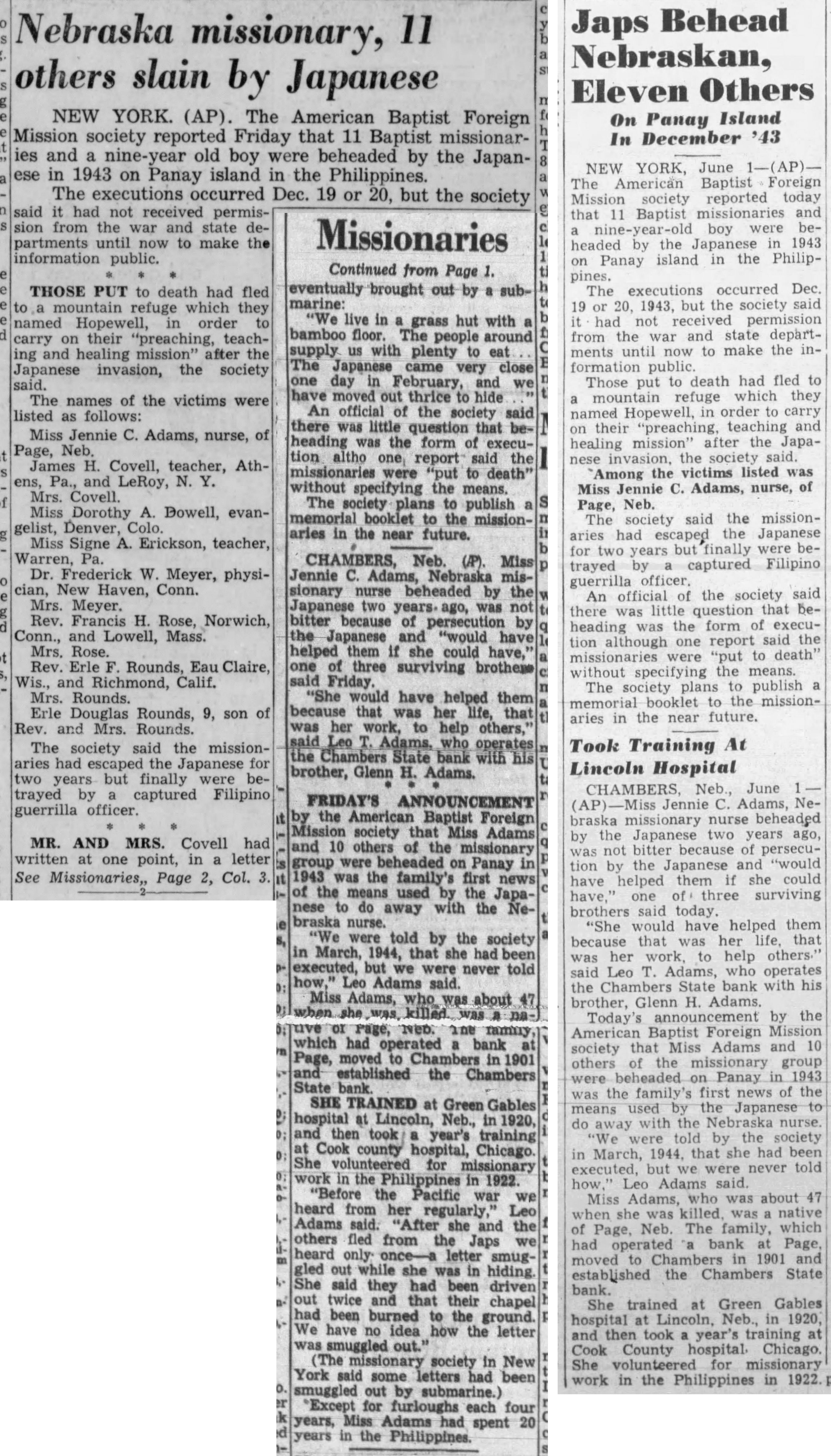 Friday's Announcement by the American Baptist Foreign Mission society that Miss Adams and 10 others of the missionary group were beheaded on Panay in 1943 was the family's first news of the means used by the Japanese to do away with the Nebraska nurse.