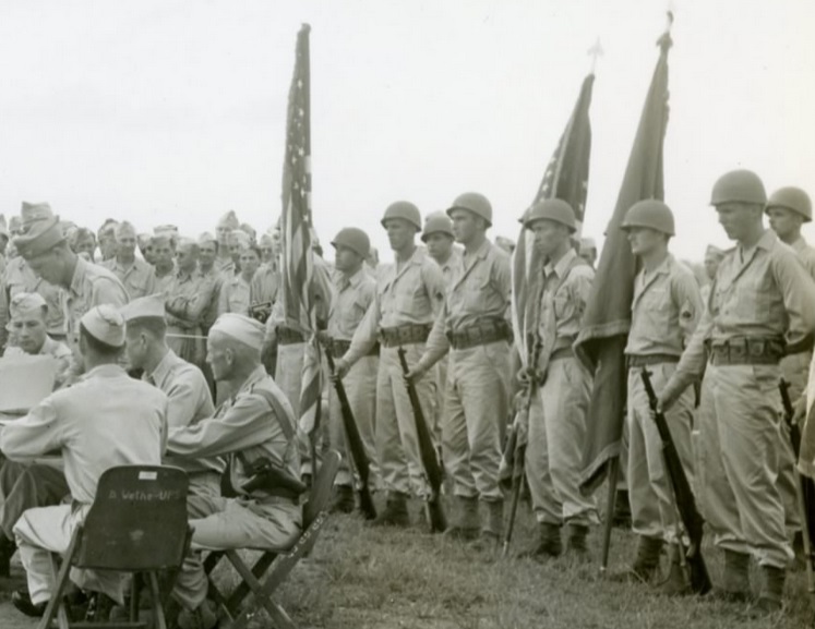 In attendance to witness the ceremony were Brigadier General Donald J. Myers, commanding the 40th Infantry Division, and Rear Admiral Ralph O. Davis, USN, commanding the 13th Amphibious Group.