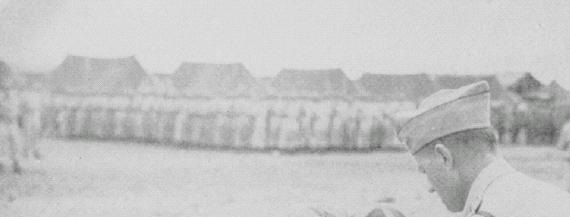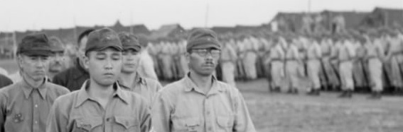 At about 1100 Hours, the trucks bearing the Japanese arrived. Upon getting down the trucks, the soldiers were formed facing the grandstand about twenty yards in front of the table in a platoon-in-line formation with four squads. The officers formed a single line in front of the platoon, while the commander, alone, positioned himself at the head of his men.