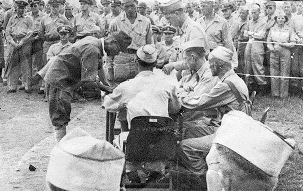 All Japanese Imperial Army officers (at least 16) were assembled to attend the surrender signing ceremony."The next day, a little after noon, all officers were assembled to attend the surrender ceremony. As we made our way to the setting of the ritual, we saw US soldiers feverishly checking out the belongings of Japanese soldiers who descended from trucks. Every one of them had gotten rid of weapons and they were running around in confusion amidst the shouting of US soldiers. The elite troops of Panay already looked quite like POWs."