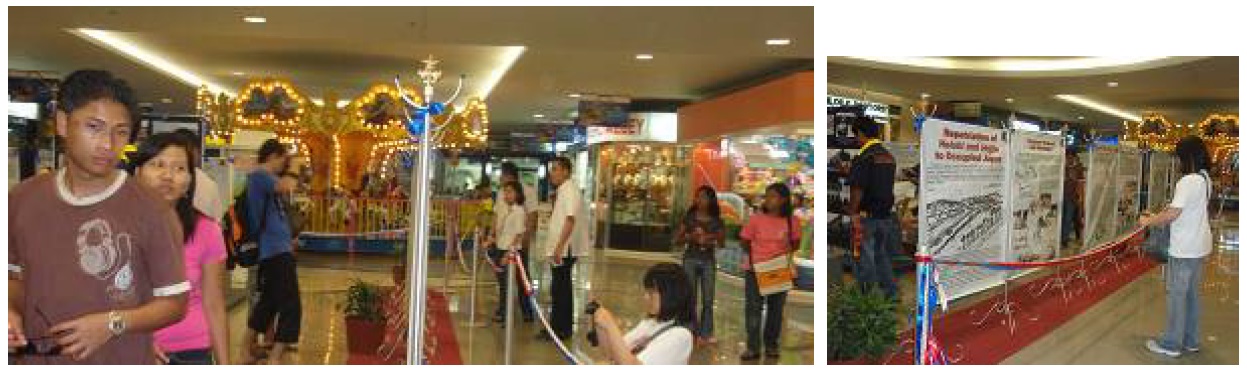 In Panay Island, which is sixth largest of all the islands of the Philippines, and situated in West Visayas, March 18 is celebrated as “Victory Day”, commemorating the landing of US Forces during the Pacific War. 64 years after the war, from March 25 to 30, former Captain Toshimi Kumai, adjutant of the Japanese Army Panay Garrison, paid his sixth visit to Panay, the first being in October 1942. At the “Pacific War Exhibition,” which is being held at the largest shopping mall of Iloilo city, 91 year-old Mr. Kumai is seen explaining the photos to the visiting citizens. Ms Chizuko Sakamoto, who used to be a student in Manila, is at the back of his wheelchair. For the special events featuring Mr. Kumai, she had flown from Seoul, where she continues her doctorate studies at Yonsei University on the issue of the comfort women. In the other photograph, author Kumai is shown autographing his book.