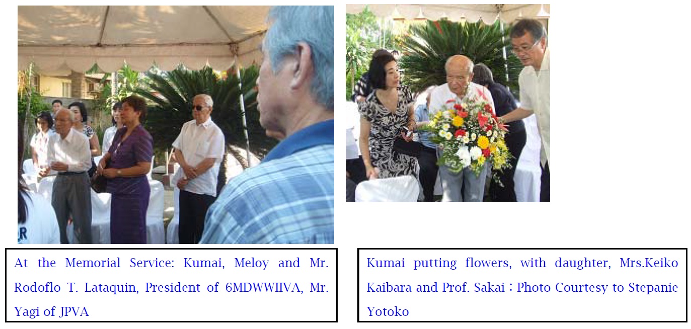From left: Chizuko, Stephanie, a volunteer for Nikkeijin-kai, Geordinie, guard of the Amigo Hotel, whose grandfather was a guerrilla in Capiz, so he had Mr. Kumai sign in his book, me, and Dawn. Ms Mila O. Yotoko, on the extreme right, is another volunteer for Nikkeijin-kai, and proud mother of capable and lovely Stephanie. Mila’s sister Jessie is Principal of the kindergarten of the Nikkeijin-kaikan. With her brother Mr Eric Yotoko, all the family, besides pursuing their own businesses, cooperated with the dedicated staff of the Nikkeijin-kai, made a great effort, and led all the visits and ceremonies to a great success, including the fantastic home made dishes at the memorial dinner. Caring for and reaching out to Mr. Kumai, protecting him from the sun with an umbrella: had it not been for the devoted assistance of the three, and Filipino friends at Nikkeijinkai, we could never have been able to have such wonderful times. Last but not least, I with all the Japanese attendants, give our big and heartfelt “Thank you” to them.