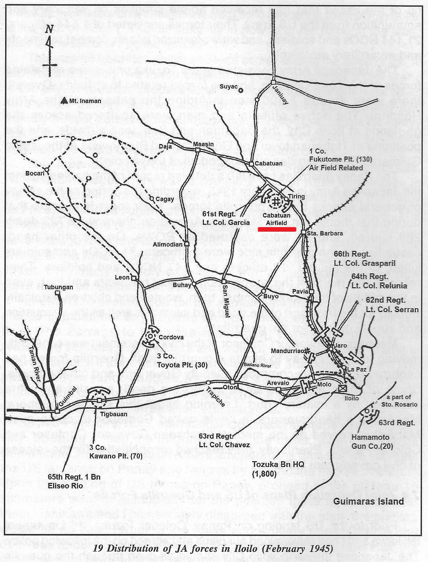 The Japanese Army consisted of the Tozuka unit, some remaining forces of the 102nd Division, and the forces related to airfields. Overall, there were around 2,500 men including the patients at the Army Hospital. The active officers and men were scattered across the garrisons at Iloilo City, the Cabatuan and San Jose airfields, and the positions at Tigbauan town and Cordova, and Buenavista at the island of Guimaras. The guerrillas surrounded all of these points.