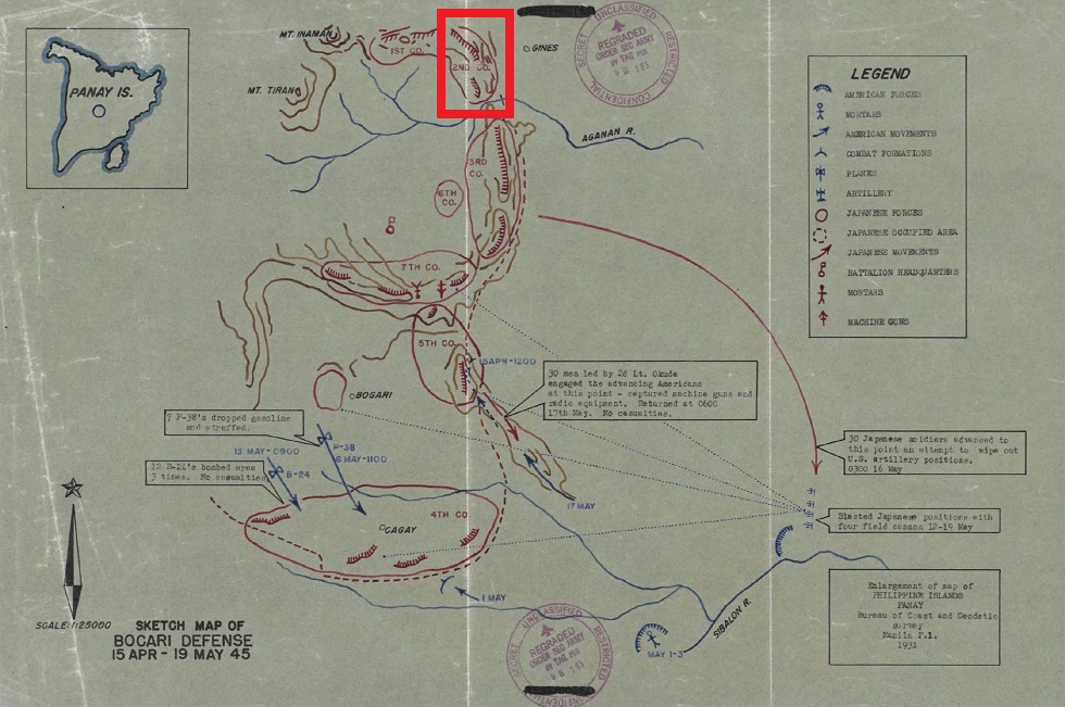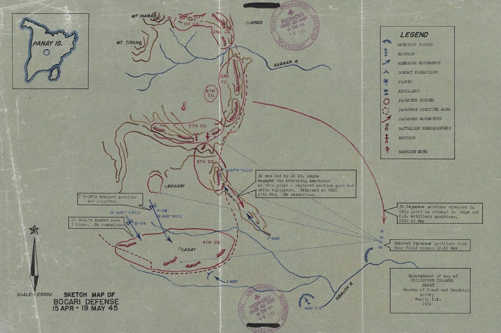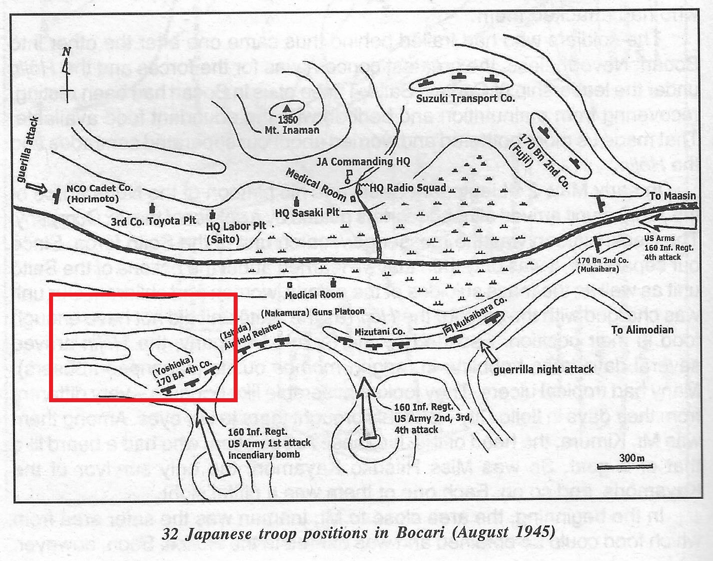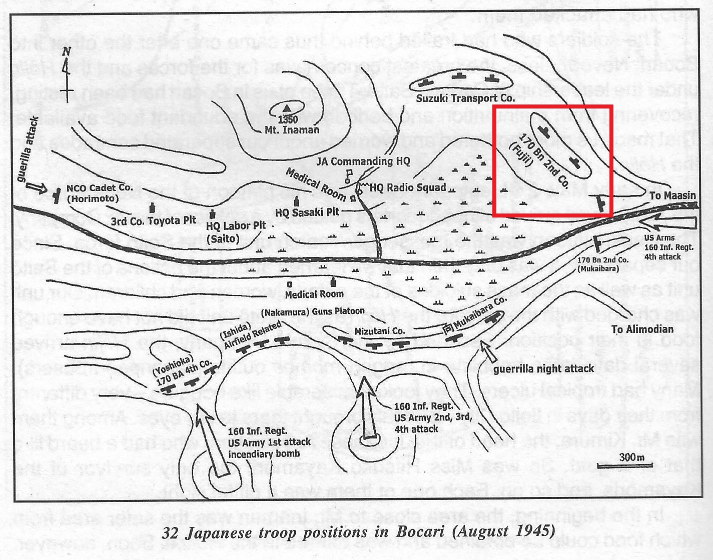 As everyone assembled, we decided on the positions of each of the forces. We could take a rest and regain physical health with abundant food, but we worried about the lack of ammunition. For the two mortars, there were only a dozen shells. Each soldier had only 140 to 150 bullets for their rifles. There were still a few thousand rounds for machine-guns but we did not have enough for a proper battle. All we could do was to pray that the enemy would not attack us.2nd Battalion 160th Infantry Regiment attacks Bocari in April and May 1945.