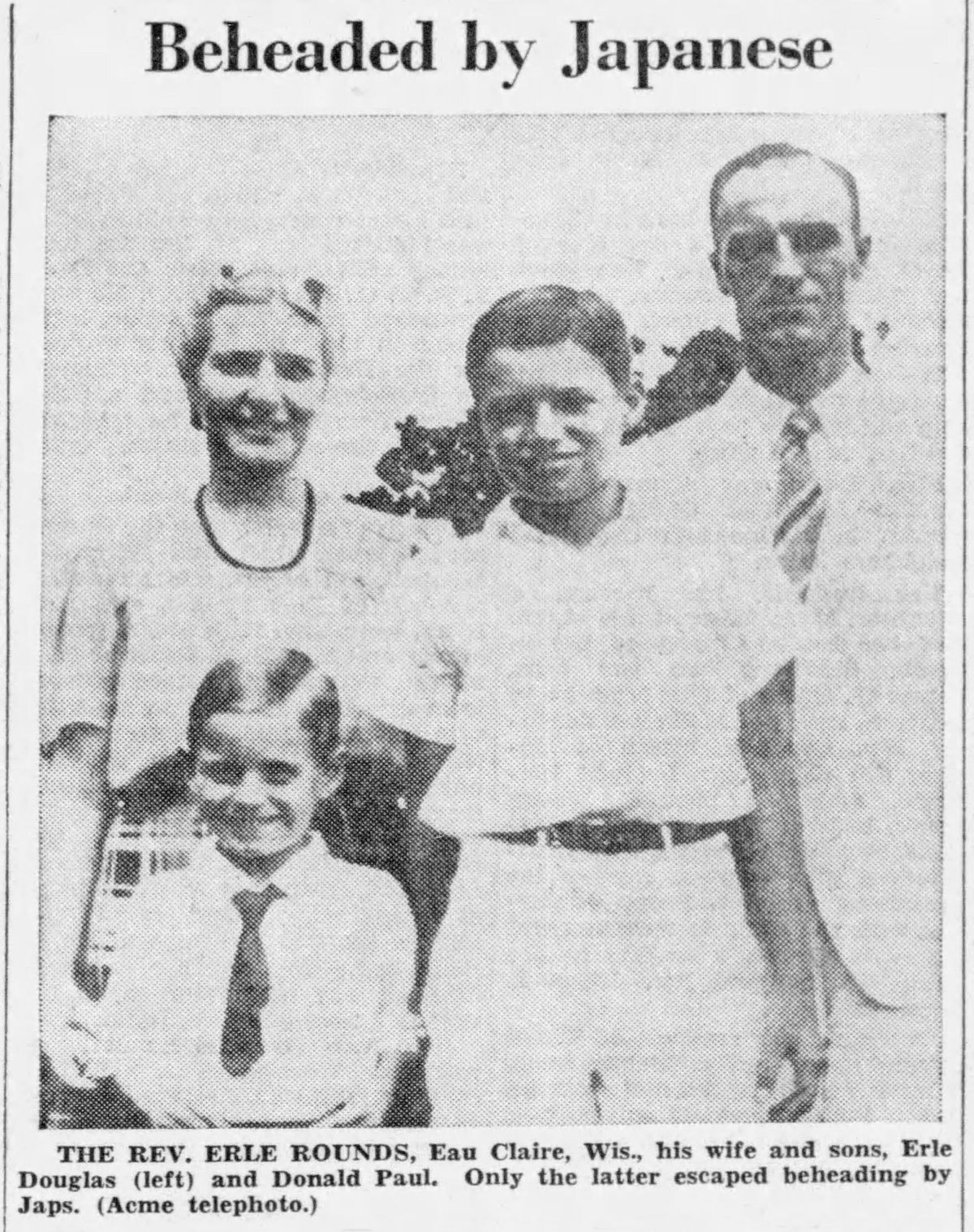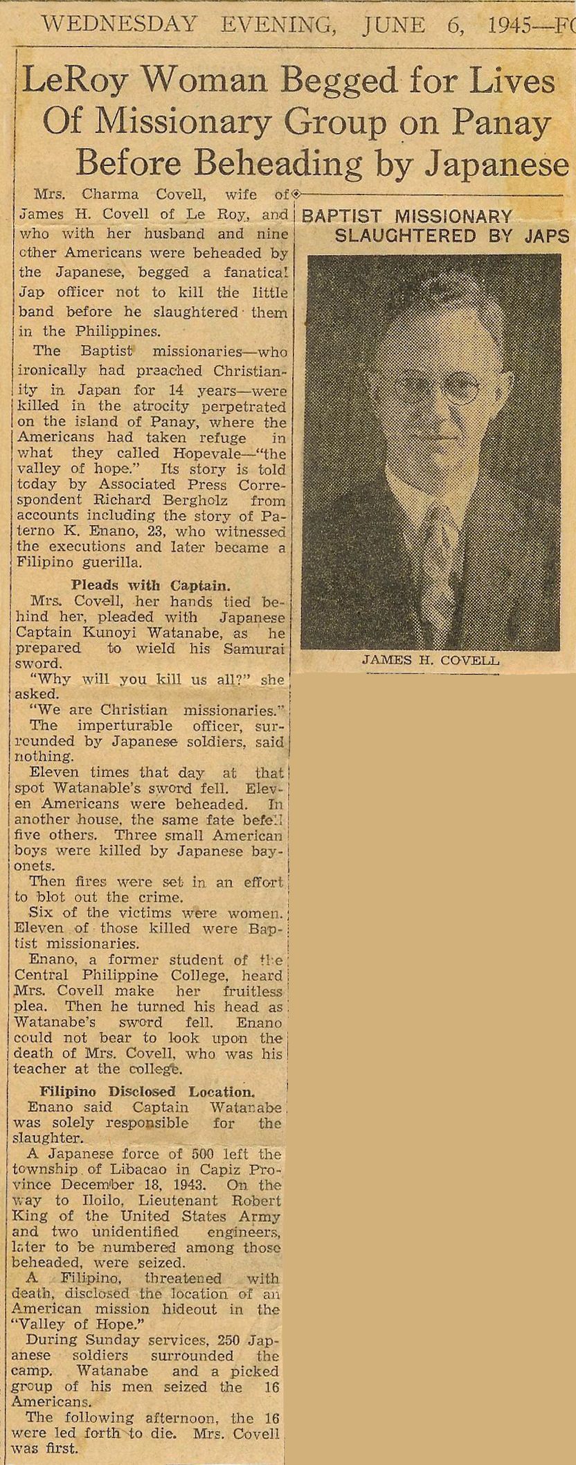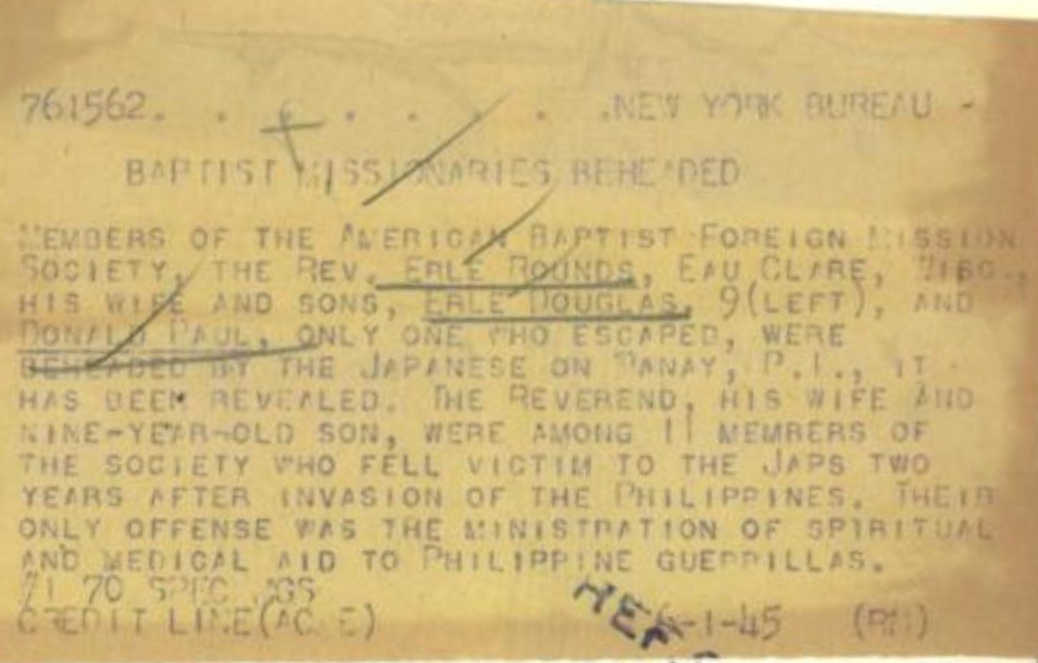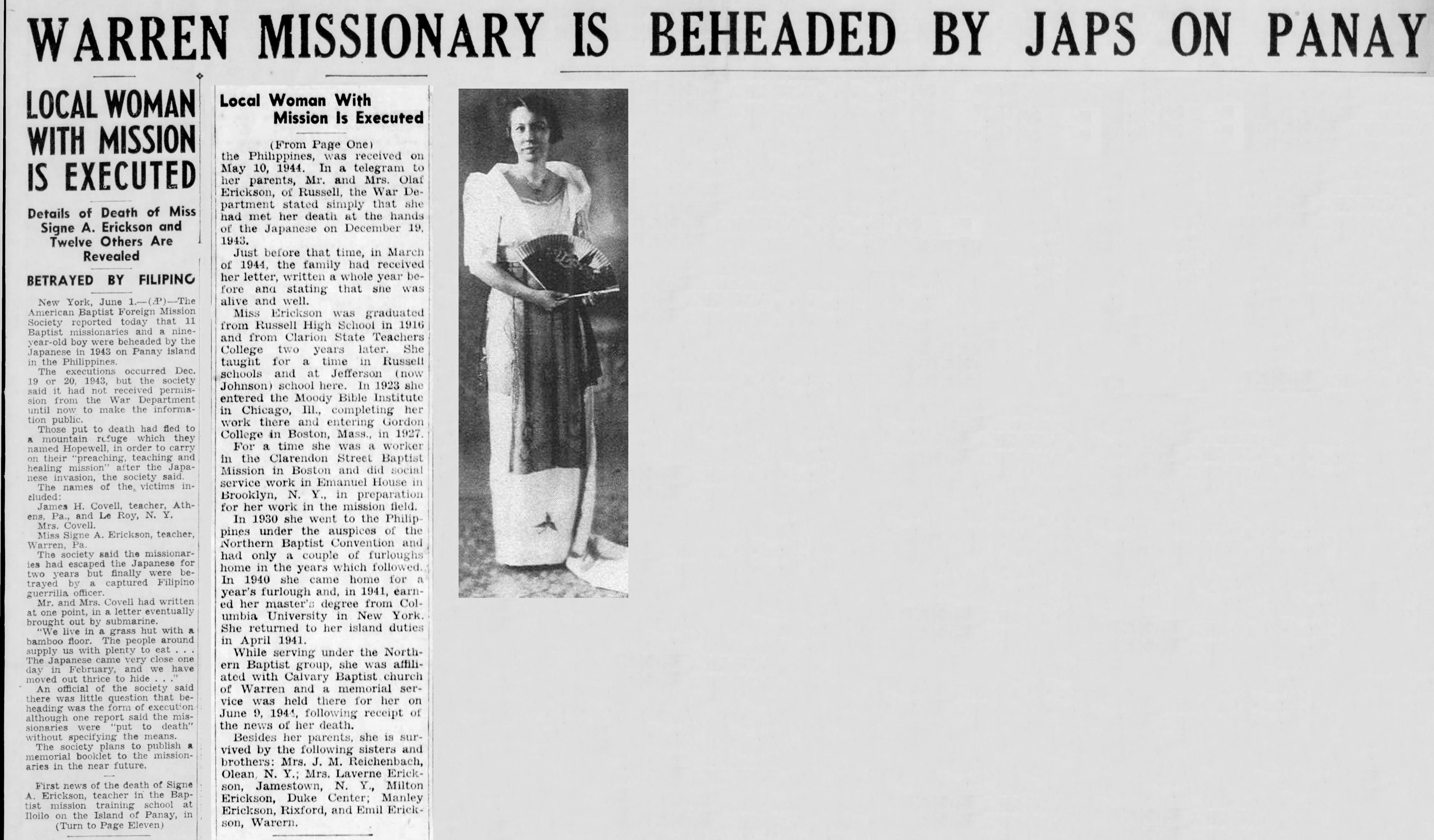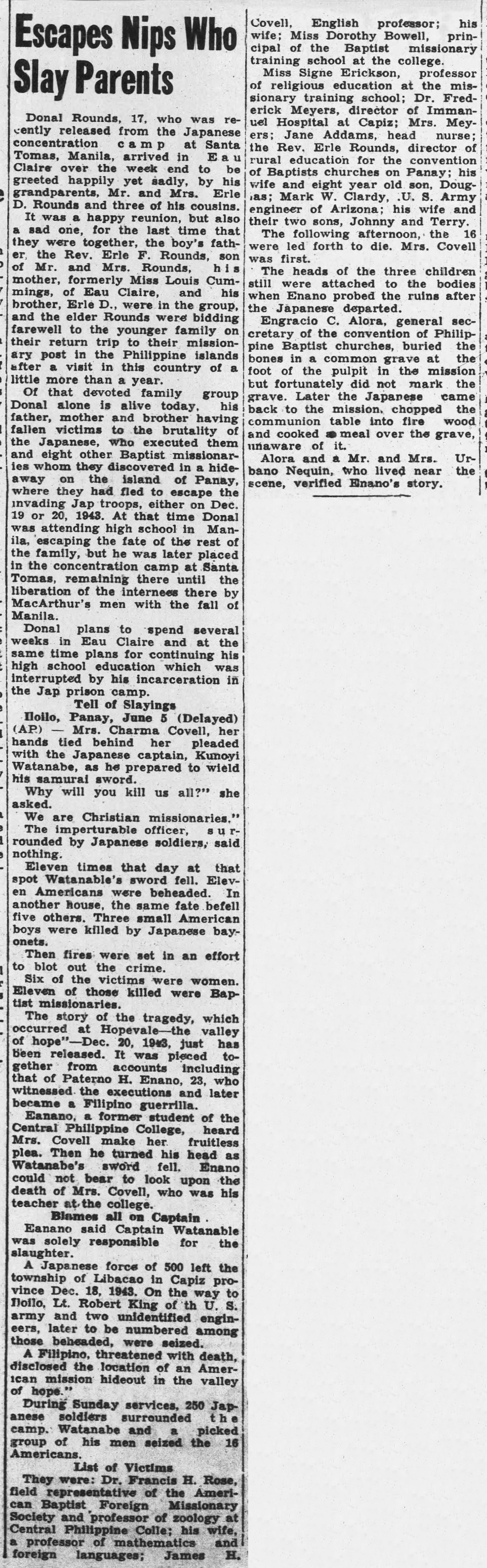 The names of the victims were listed as follows: Miss Jennie C. Adams, nurse, of Page, Neb. James H. Covell, teacher, Athens, Pa., and LeRoy, N.Y. Mrs. Covell. Miss Dorothy A. Dowell, evangelist, Denver, Colo. Miss Signe A. Erickson, teacher, Warren, Pa. Dr. Frederick W. Meyer, physician, New Haven, Conn. Mrs. Meyer Rev. Francis H. Rose, Norwich, Conn., and Lowell, Mass. Mr. Rose Rev. Erle F. Rounds, Eau Claire, Wis., and Richmond, Calif. Mrs. Rounds Erle Douglas Rounds, 9, son of Rev. and Mrs. Rounds The society said the missionaries had escaped the Japanese for two years but finally were betrayed by a captured Filipino guerrilla officer.