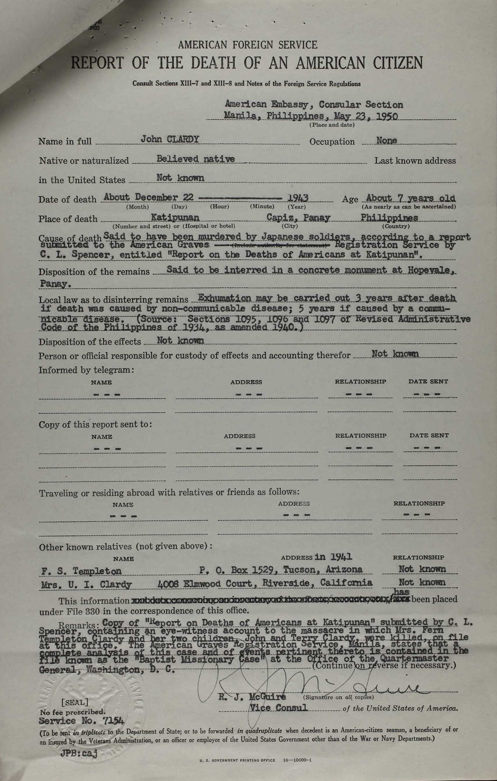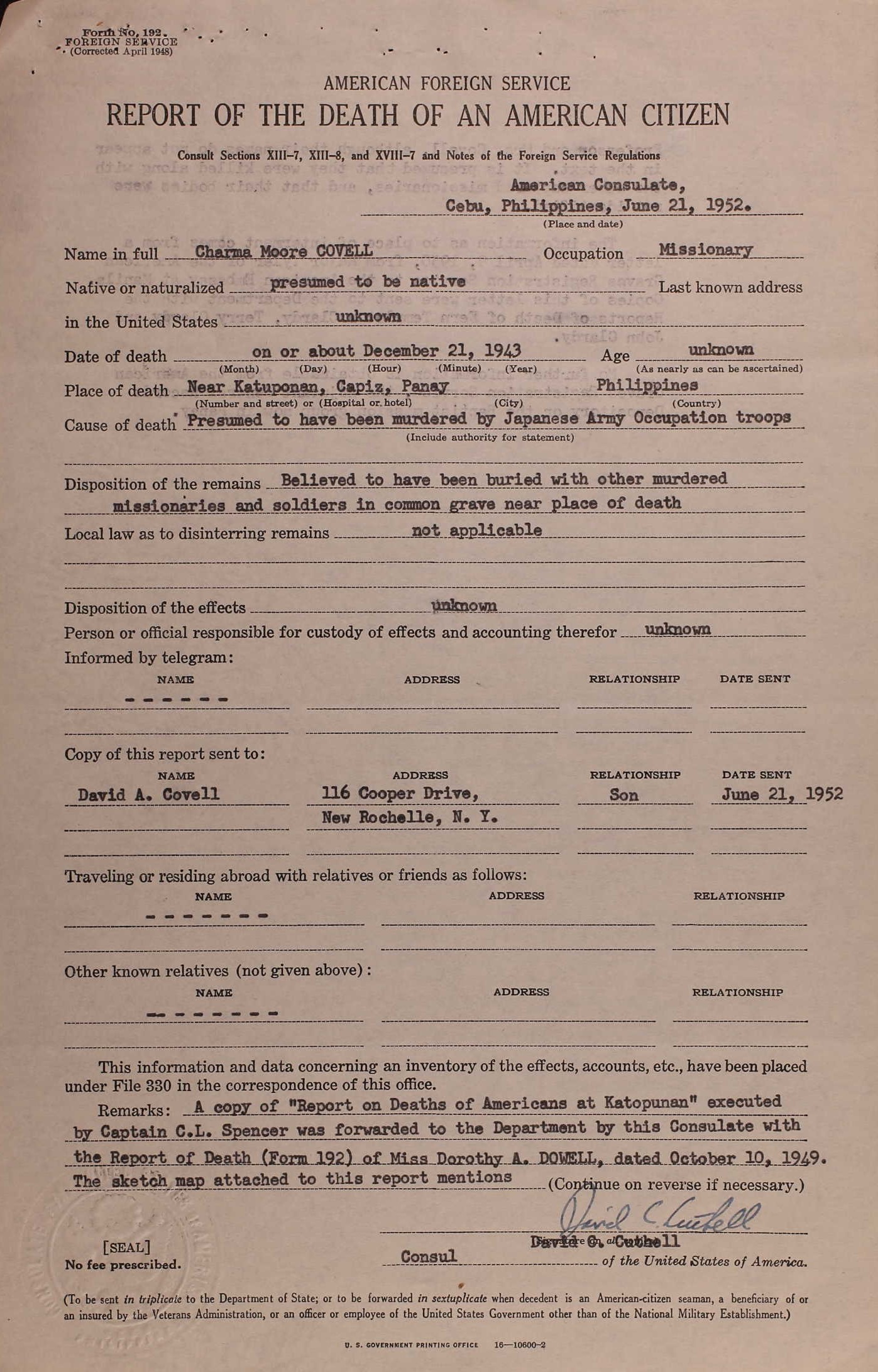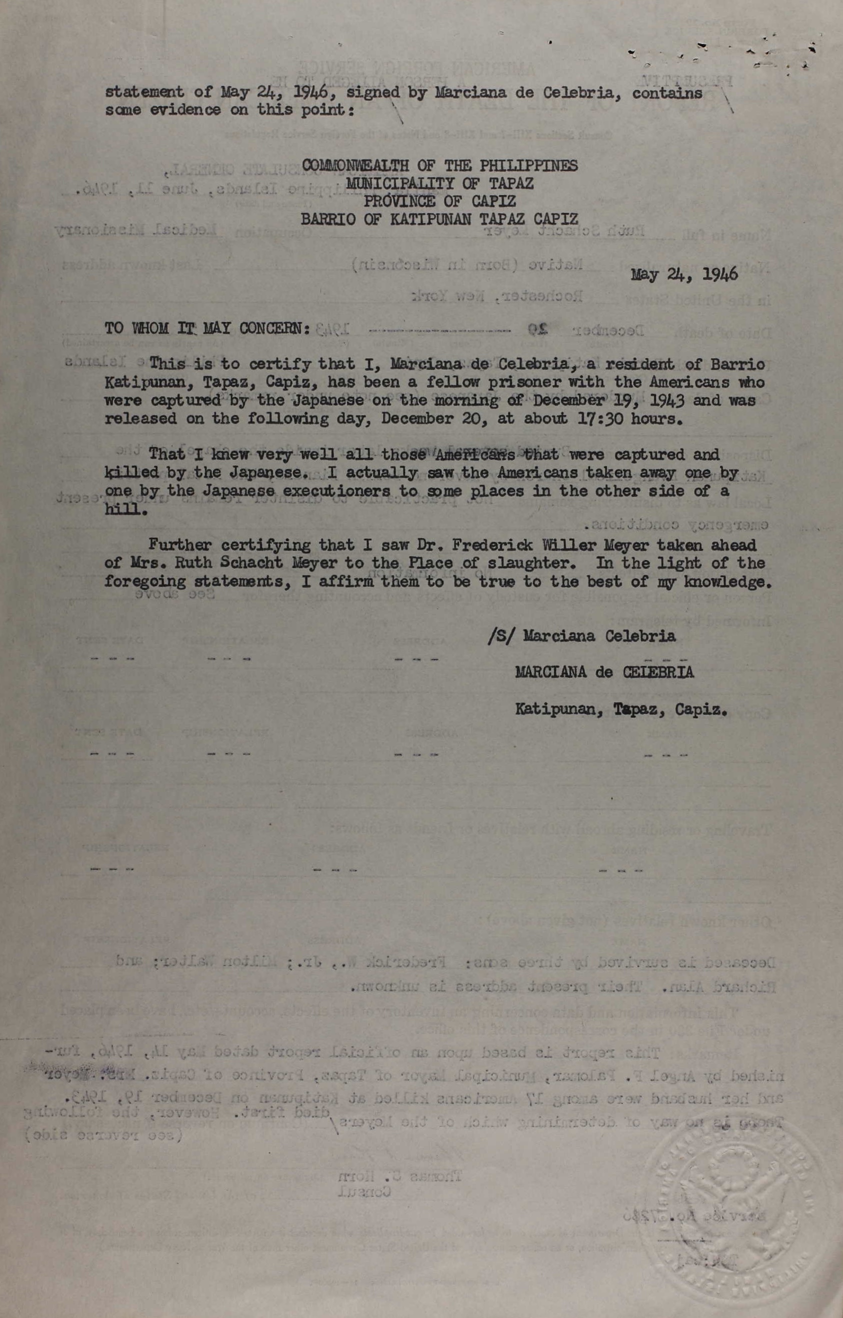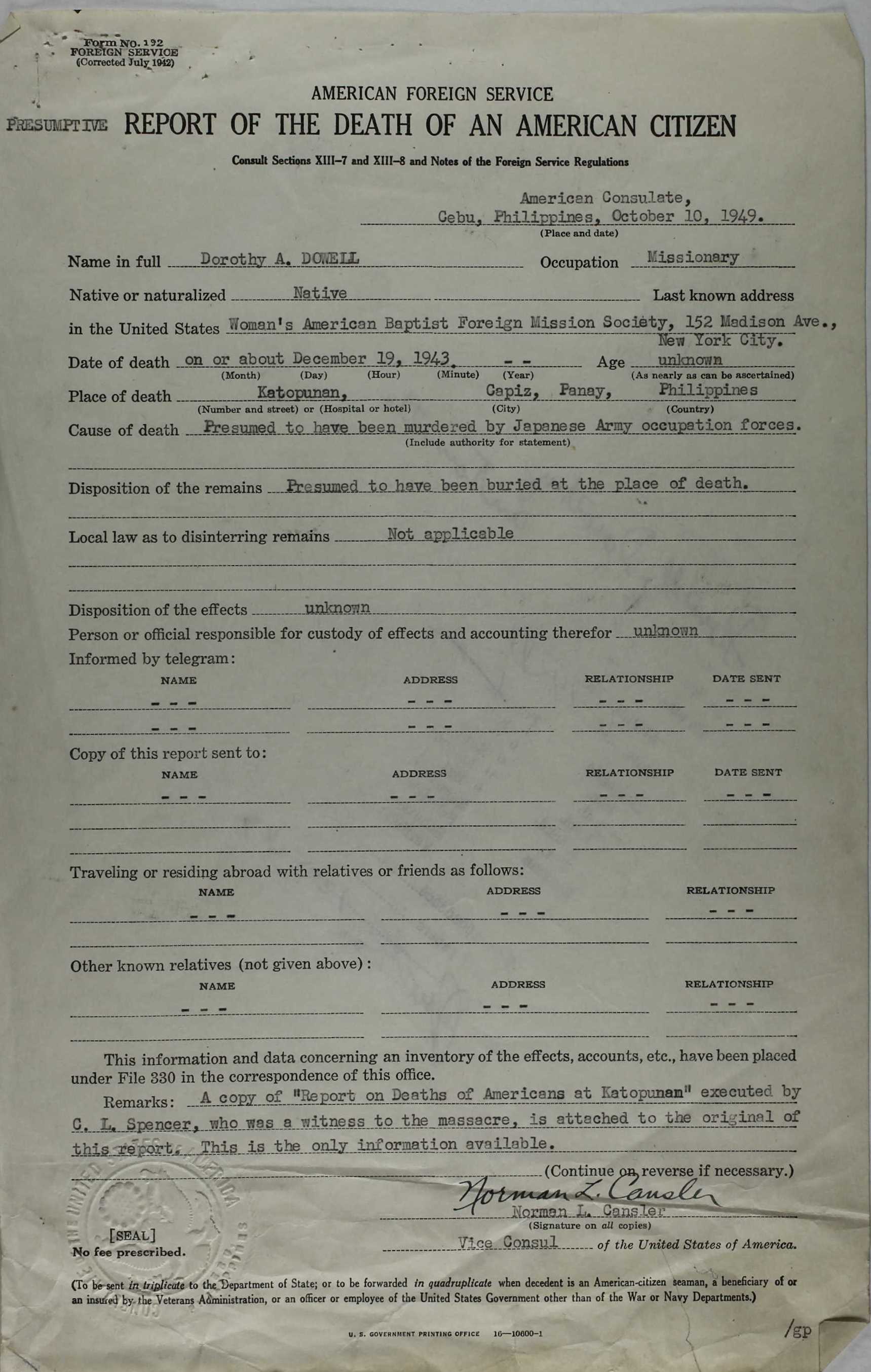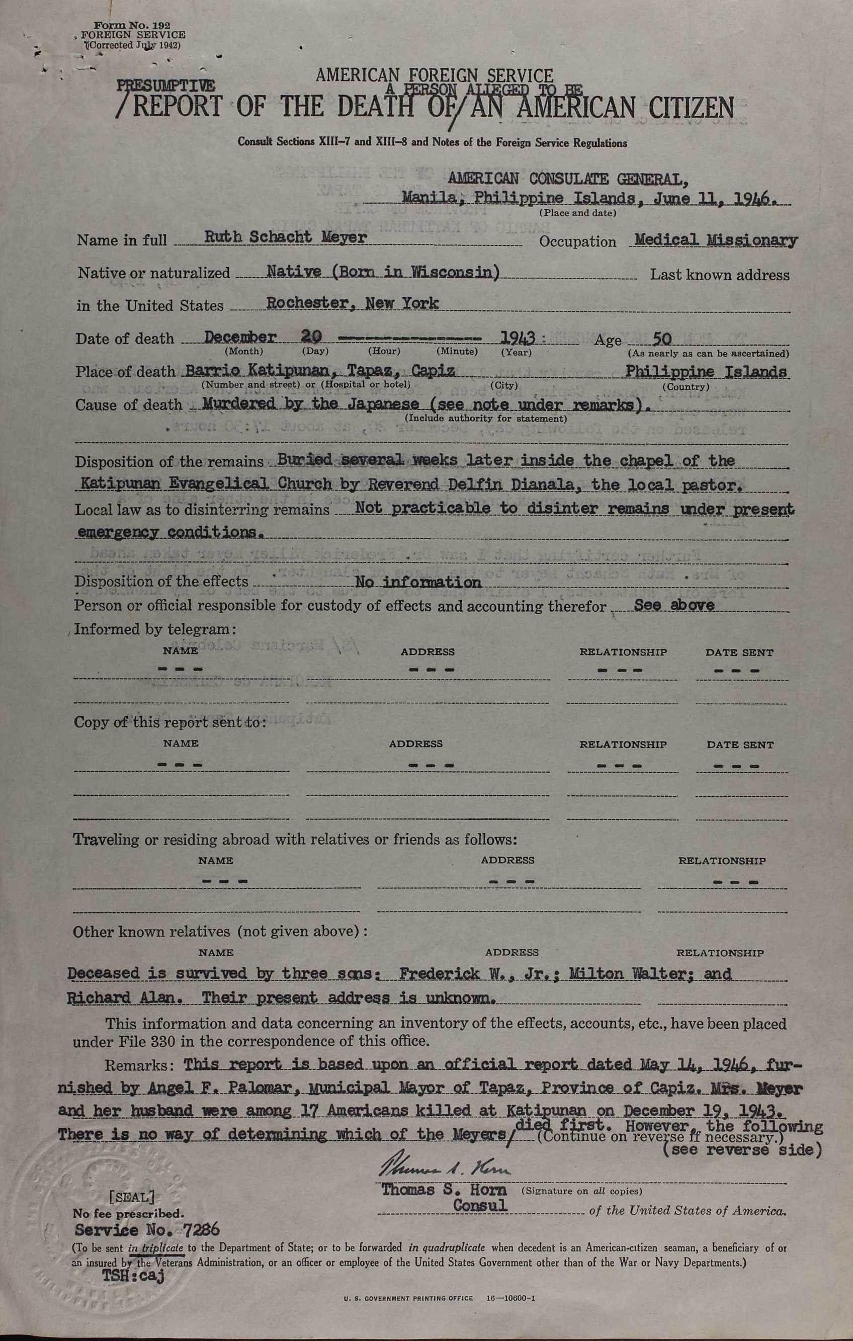 The names of the victims were listed as follows: Miss Jennie C. Adams, nurse, of Page, Neb. James H. Covell, teacher, Athens, Pa., and LeRoy, N.Y. Mrs. Covell. Miss Dorothy A. Dowell, evangelist, Denver, Colo. Miss Signe A. Erickson, teacher, Warren, Pa. Dr. Frederick W. Meyer, physician, New Haven, Conn. Mrs. Meyer Rev. Francis H. Rose, Norwich, Conn., and Lowell, Mass. Mr. Rose Rev. Erle F. Rounds, Eau Claire, Wis., and Richmond, Calif. Mrs. Rounds Erle Douglas Rounds, 9, son of Rev. and Mrs. Rounds The society said the missionaries had escaped the Japanese for two years but finally were betrayed by a captured Filipino guerrilla officer.