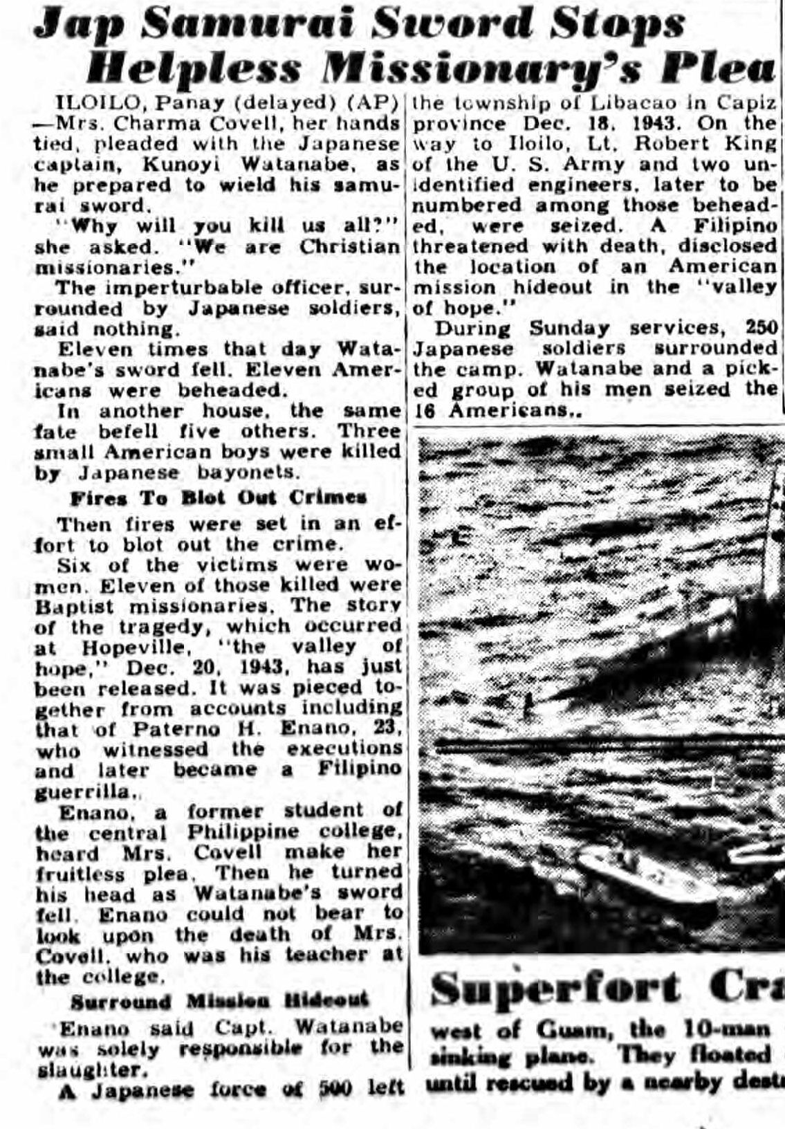 "Before the Pacific war we heard from her regularly," Leo Adams said. "After she and the others fled from the Japs we heard only once - a letter smuggled out while she was in hiding. She said they had been driven out twice and that their chapel had been burned to the ground. We have no idea how the letter was smuggled out."