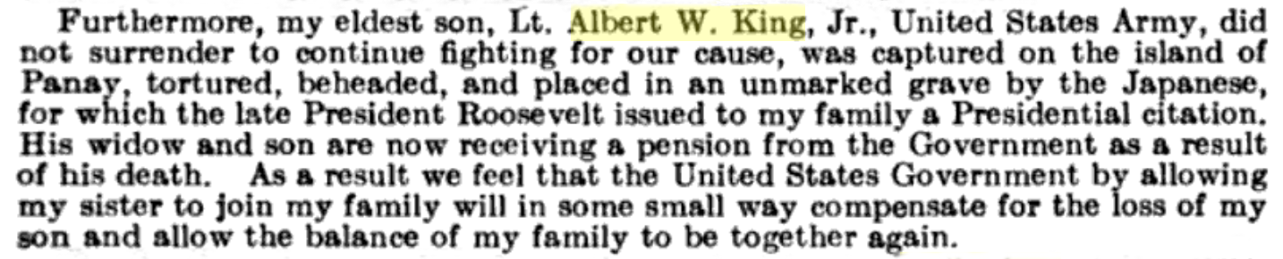 Source: From the petition request of his mother, Dr. Paz Garcia King for her sister, Rosario Garcia Jimeno, to be allowed to emigrate to the United States from the Philippines. Request made in October, 1950.