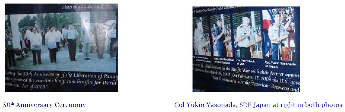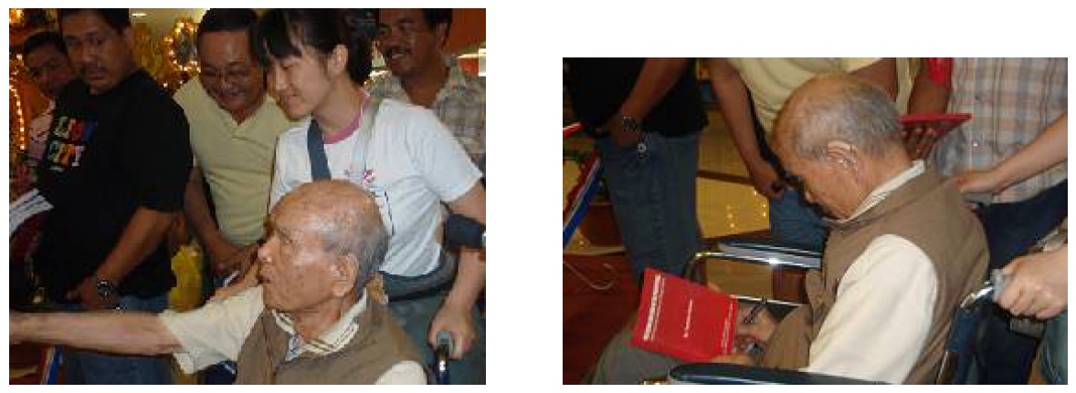In Panay Island, which is sixth largest of all the islands of the Philippines, and situated in West Visayas, March 18 is celebrated as “Victory Day”, commemorating the landing of US Forces during the Pacific War. 64 years after the war, from March 25 to 30, former Captain Toshimi Kumai, adjutant of the Japanese Army Panay Garrison, paid his sixth visit to Panay, the first being in October 1942. At the “Pacific War Exhibition,” which is being held at the largest shopping mall of Iloilo city, 91 year-old Mr. Kumai is seen explaining the photos to the visiting citizens. Ms Chizuko Sakamoto, who used to be a student in Manila, is at the back of his wheelchair. For the special events featuring Mr. Kumai, she had flown from Seoul, where she continues her doctorate studies at Yonsei University on the issue of the comfort women. In the other photograph, author Kumai is shown autographing his book.
