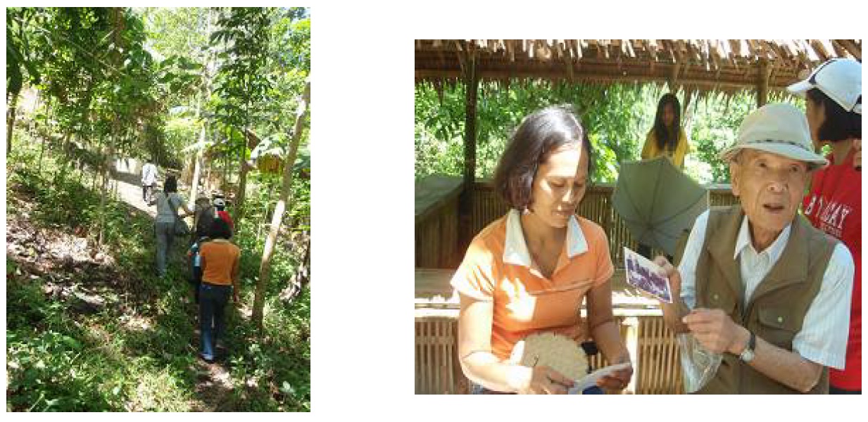 Mr. Kumai and his group visited Soyac, in vehicles provided by UP Visayas through the kind arrangement by Professor Meloy. On the way, he explained a lot of sites familiar to him in his war memories. He looked touched to see the very buildings he knew that have survived all these years. The area where a group of hojin, led by Principal Kayamori of the Iloilo Japanese School, killed themselves, was away from the city, after the car had climbed up the narrow mountain path for some time. Everyone, including Kumai, had to get off and walk the last distance. After the remains and memorial plaque had been moved into the new memorial at site of the Nikkeijin-kaikan, the place was turned into a “Peace Park,” where a comfortable hut, with bench, was newly built in front of the old Memorial. After the original plaque was relocated, a new one by the Nikkeijin-kai was installed.