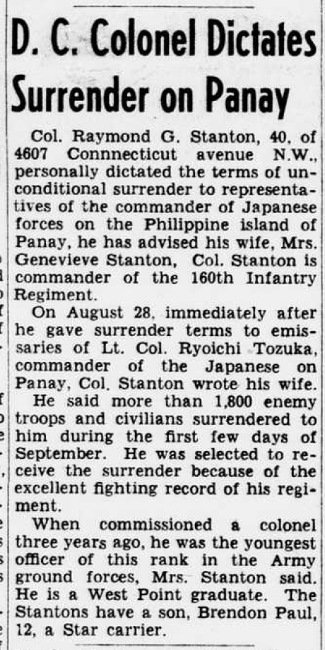 At the surrender signing ceremony at Cabatuan Airfield on September 2, 1945, the instrument of surrender was signed by the overall Japanese commander Lieut. Col. Ryoichi Tozuka for the Japanese, and by the 160th US Infantry Regiment commander Col. Raymond G. Stanton for the Americans and Filipinos. Protocol dictates that a surrender be received by an officer of about the same rank and position, and so Col. Stanton was designated to receive even though his superiors were also present.