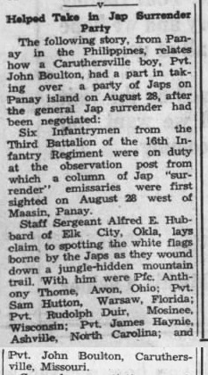 When we finally got back on Panay, our regimental commander, Colonel Stanton, who was a West Pointer, said, "The war is over. Starting this Saturday, we will have a parade in dress uniform every Saturday," and so, the next Saturday, … the first time I'd worn a tie in some time, we got on our dress uniforms and we were in suntans, so, it wasn't jackets or anything like that and we were standing parade and the General was making his inspection and he was just up to my [platoon]. At that point, I had the I&R platoon and somebody came rushing in, a Filipino farmer, … and talked to somebody and they finally interrupted, rushed up to the Colonel and said, "This farmer has just seen some Japs within, probably, a mile of our camp," and so, the Colonel turned to me and he said, "Bulling, take a patrol out and find out about this."