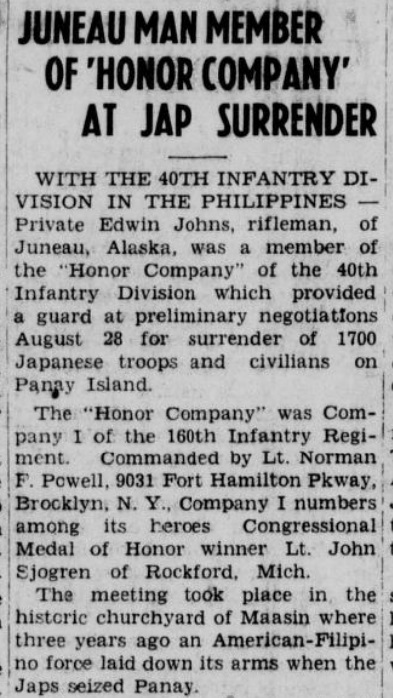The "honor company" was Company I of the 160th Infantry Regiment. Commanded by Lt. Norman F. Powell, 9031 Fort Hamilton Pkway, Brooklyn, N.Y., Company I numbers among its heroes Congressional Medal of Honor winner Lt. John Sjogren of Rockford, Mich.