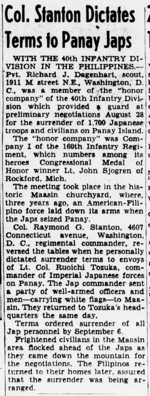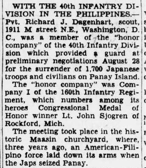 Pvt. Richard J. Dagenhart, scout, 1911 M street N.E., Washington D. C., was a member of the "honor company" of the 40th Infantry Division which provided a guard at preliminary negotiations August 28 for the surrender of 1,700 Japanese troops and civilians on Panay Island.