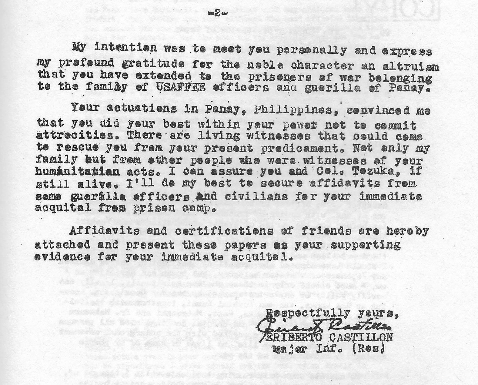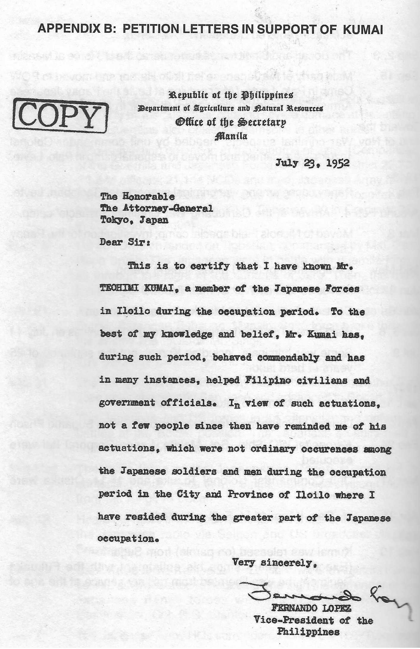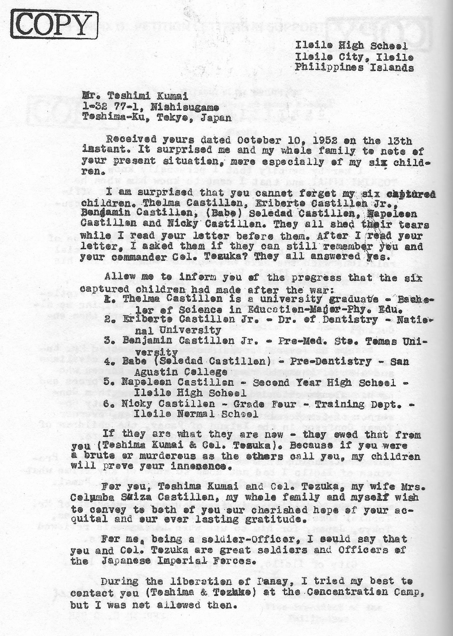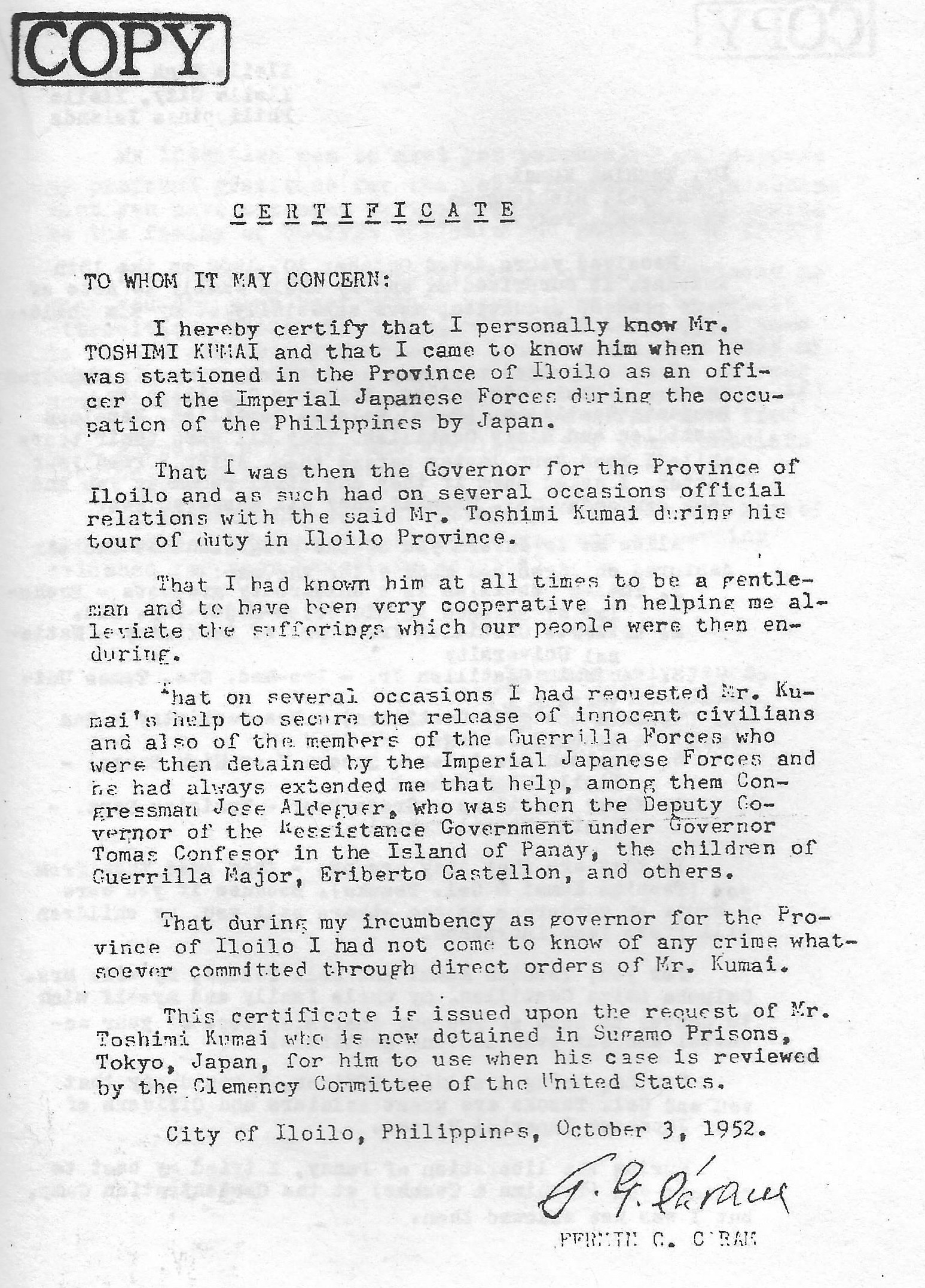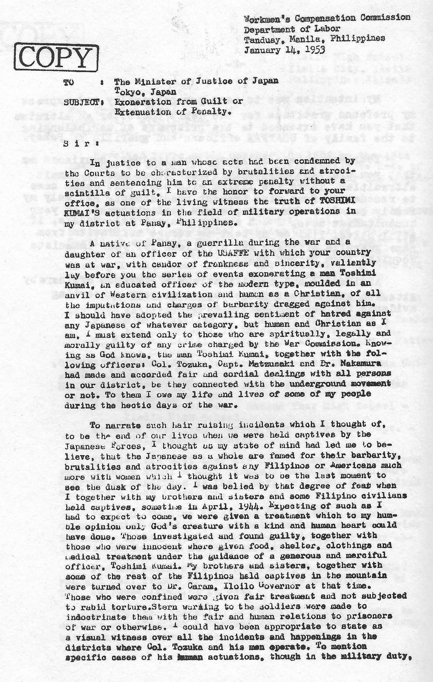 morally guilty of any crime charged by the War Commission. Knowing as God knows, the man Toshimi Kumai, together with the following officers: Col. Tozuka, Capt. Matzusaki and Dr. Nakamura had made and accorded fair and cordial dealings with all persons in our district, be they connected with the underground movement or not. To them I owe my life and lives of some of my people during the hectic days of the war.