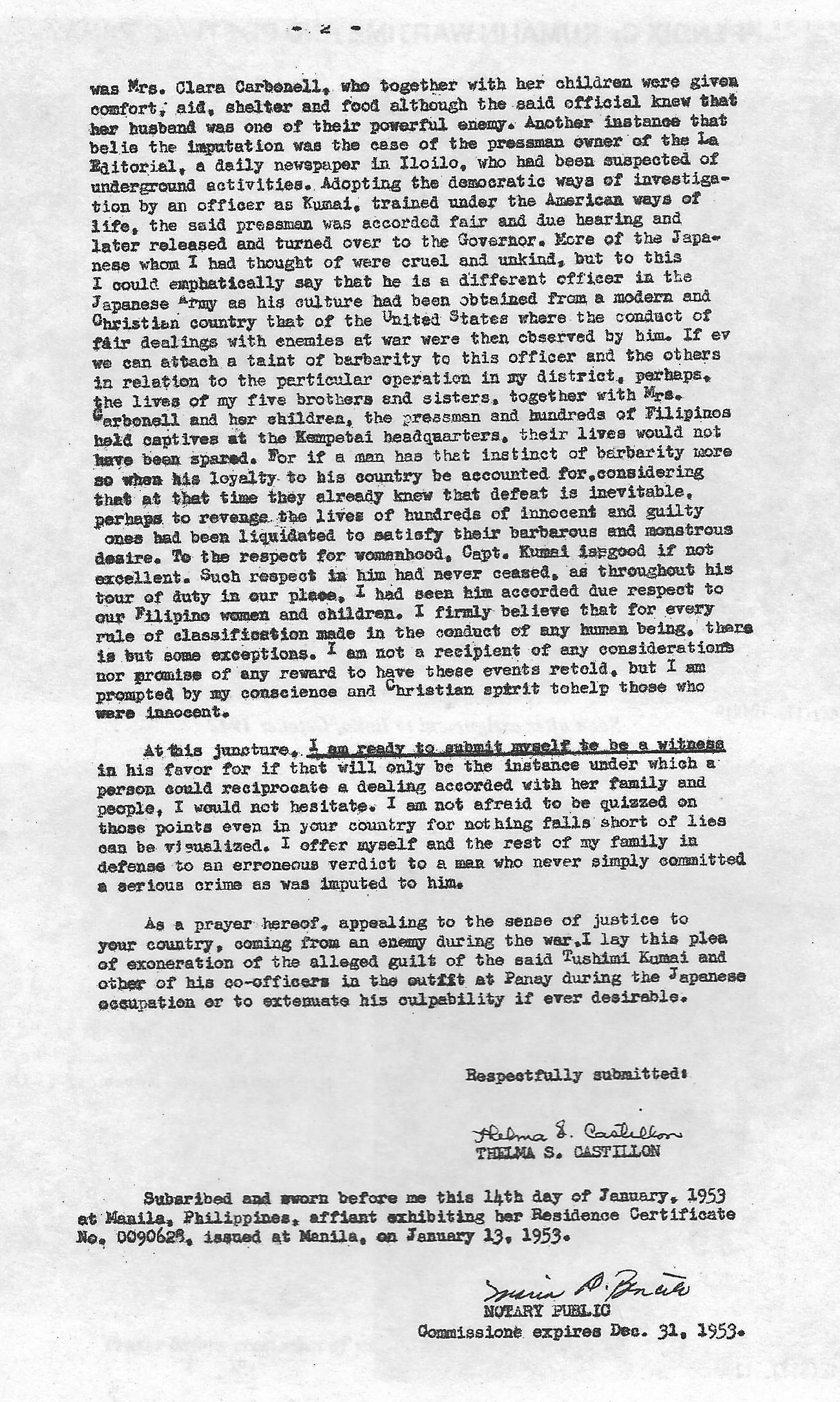 Subscribed and sworn before me this 14th day of January, 1953, at Manila, Philippines, affiant exhibiting her residence Certificate No. 0090628, issued at Manila, on January 13, 1953